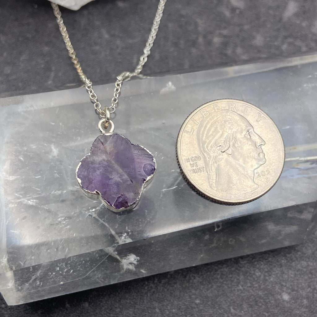This adorable Amethyst flower, set in silver leaf and teamed with our sterling silver micro cable chain, is absolutely delightful. The vibrant purple tones and eye-catching white stripes make this amethyst uniquely enchanting!