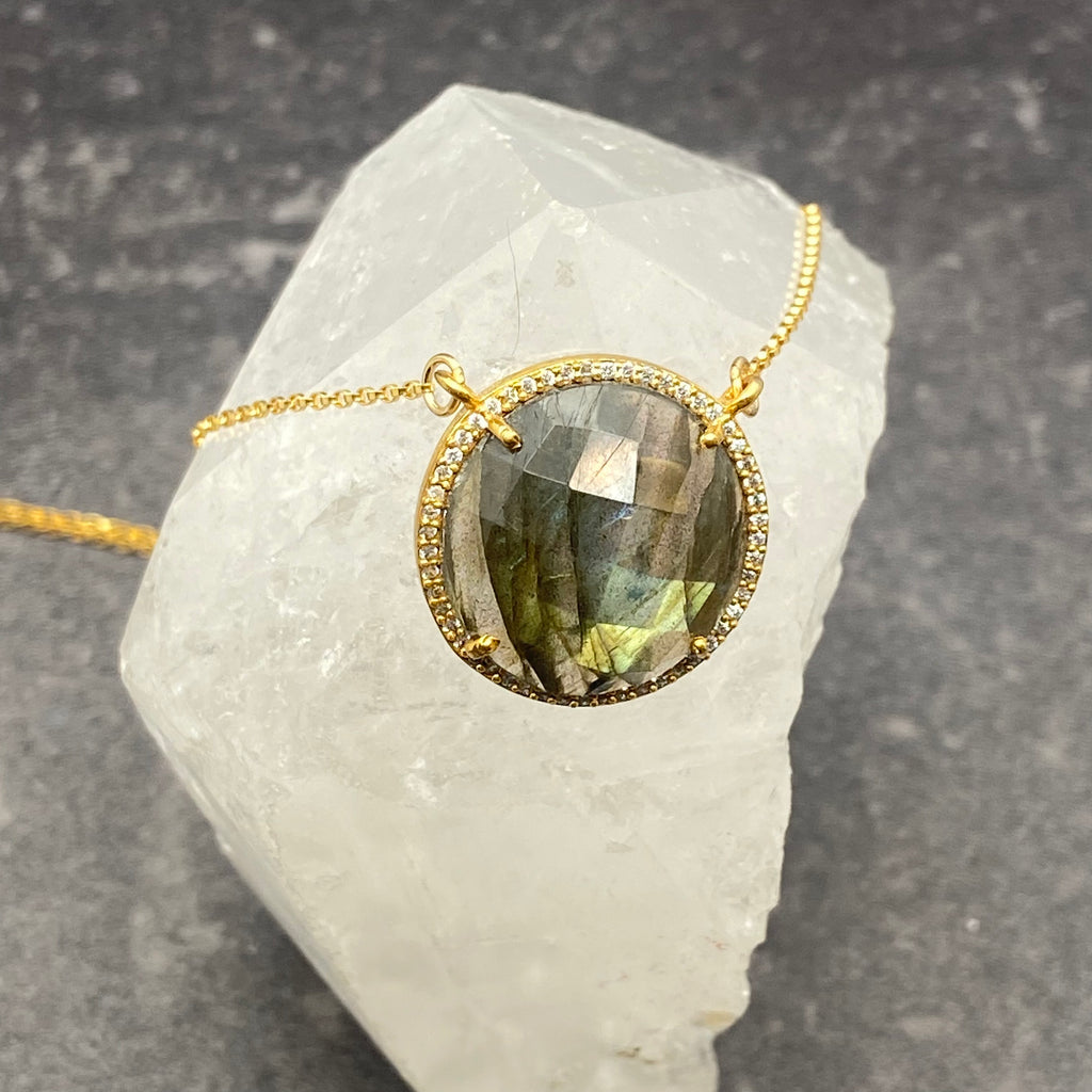 This eye catching stone with flashes of blue, green, and hazel is stunning! A halo of cubic zirconia gives this faceted labradorite stone necklace that extra touch of glam. It is paired with our gold filled thin rolo chain.